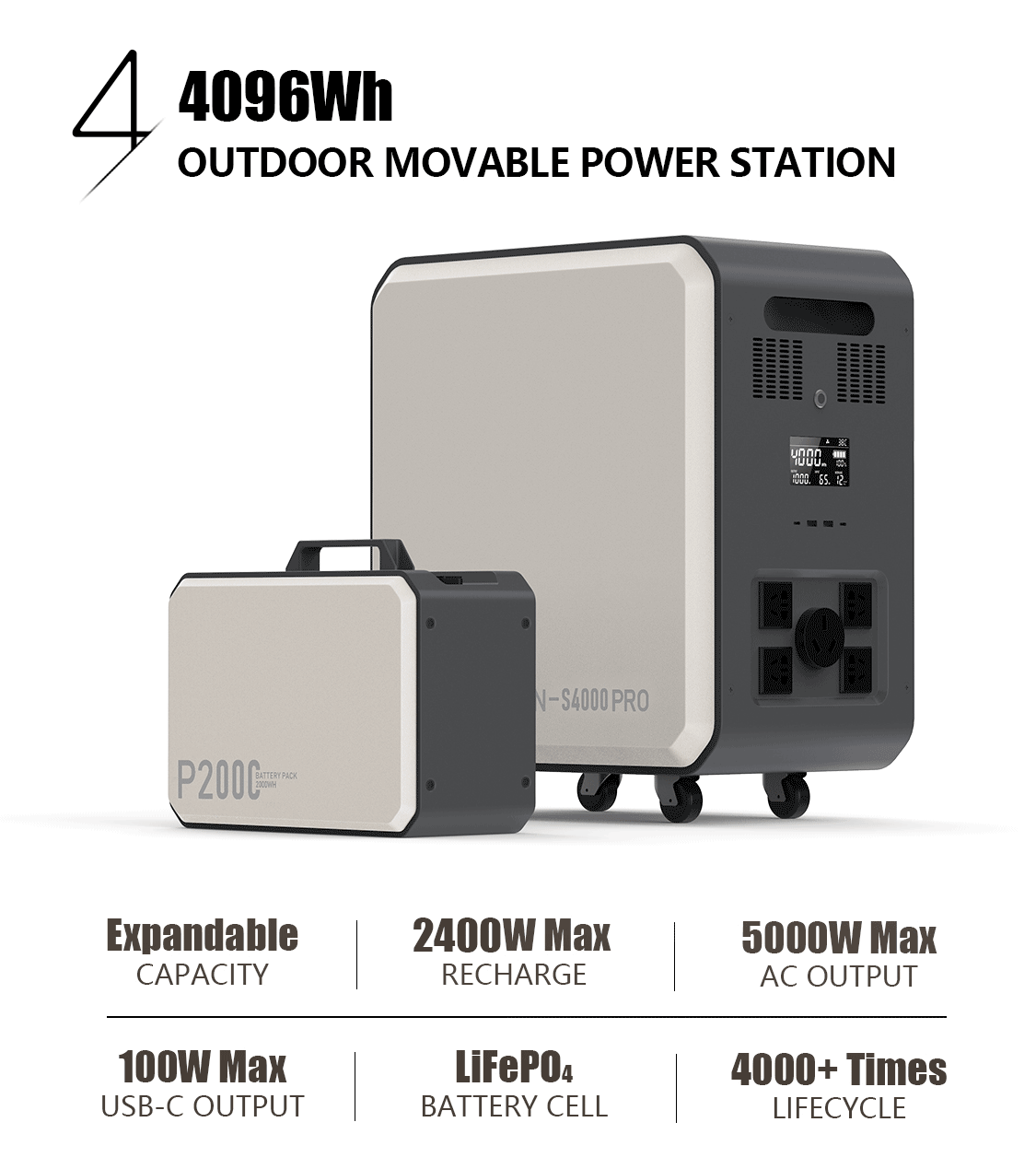 电池采用自研40Ah大单体磷酸铁锂电芯,拥有4000+次超长循环寿命,内阻小于0.5毫欧。对比相同容量产品,所需电芯数量更少,降低电芯均衡、温控等电池管理难度,整体性能更加安全可靠。 户外电源产品容量规格多样性,输出功率有大有小,可覆盖众多用电场景,比如露营、路演、户外工程、长途旅行、房车生活等。